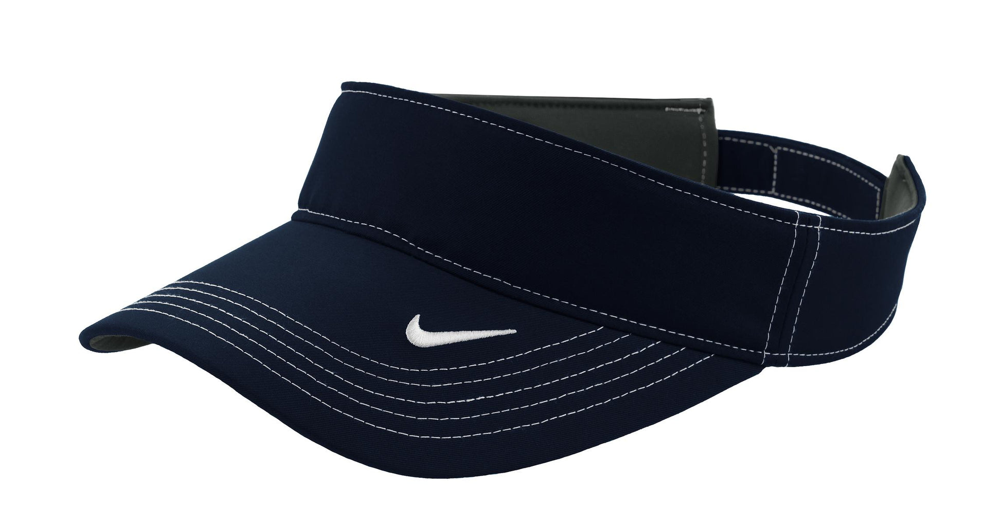 A high-performance, three-panel visor built with Dri-FIT moisture management technology. Contrast stitching adds interest, while the hook and loop closure ensures a custom fit. The contrast Swoosh design trademark is embroidered on the bill. Front panel measures approximately 1.875 h x 10 w. Made of 100% Dri-FIT polyester twill.